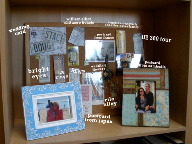 I just stashed this bulletin board here temporarily but it turned out to be the perfect solution! The cork color and light wood frame make it stand out texture-wise but blend in color-wise. All the stuff tacked on is of sentimental value, which is even better. Ticket stubs for concerts and plays, postcards from our friends around the world, a boutonniere from our wedding, and more. The space in between the picture frames is where our daily mail lands. I removed it for the photo-op but it’s back up there now. ;)