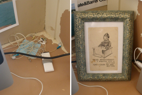 Another idea is to get a decorative box and punch some holes in the sides and schloop the stuff in the box and take the cords out the holes into the device.