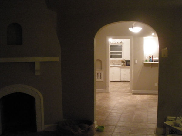 When you enter the front door, you step into the living room, with non-functioning fire place, which you can kind of see here. I can’t wait to paint everything a lighter shade and liven up the inside of the fire place with a glossy pop of color! The reason the front room light isn’t on is so you can get a better view of what lies beyond the arched doorway… the dining room, kitchen (you can see the cabinets) and small strange off-kitchen nook. The nook has a window with a high bar counter. I can envision eating breakfast there.