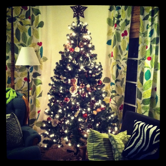 Did I mention that the tree had been left here (standing up, fully assembled) in the basement when we moved in?? Talk about a bargain! At first I was really creeped out by the concept of a Christmas tree that had been abandoned in a cold clammy basement, but since we’d had the whole house fumigated before moving in, I figured it wasn’t harboring any pests. Except for the pesky silver aluminum tinsel (the individual pieces, not the garland) that we meticulously picked off by hand before adding our ornaments.