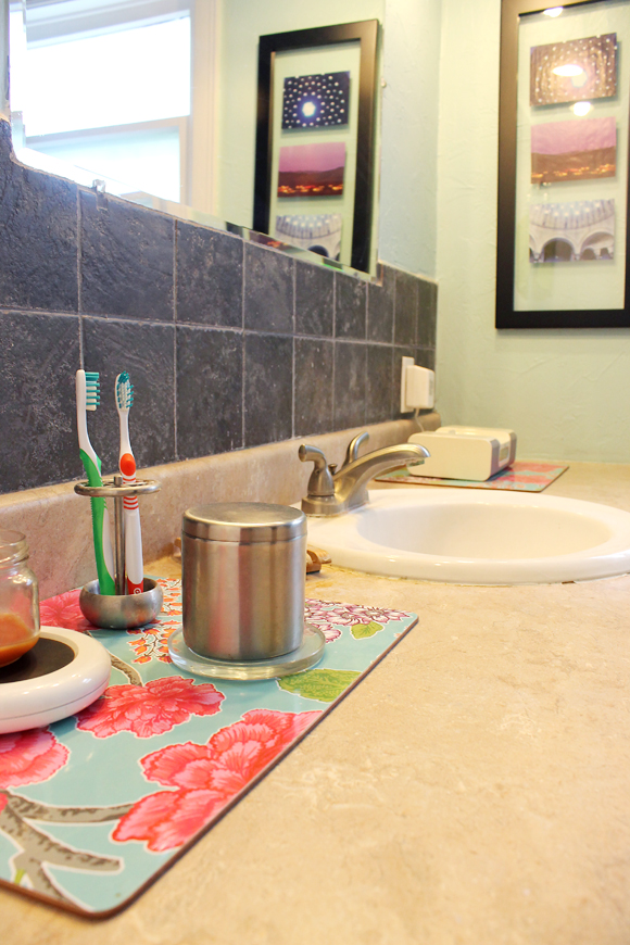 Let’s get started! Mostly I wanted to show off some items I got at a design swap one of my gal pals hosted a month ago (it has been a month already! sheesh!). The colorful placemats you’ll see here are in the bathroom mostly because there were only three instead of four. If there were four I would use them in the dining room for (duh) placemats but I got creative and I love how they bring a little bit of pink in and really perk up the room. They also make it easy to tidy up. They help me tell myself, “Objects do not belong on the tan section of the counter! Hide them in drawers or cabinets!” It’s a little strange, but it works.