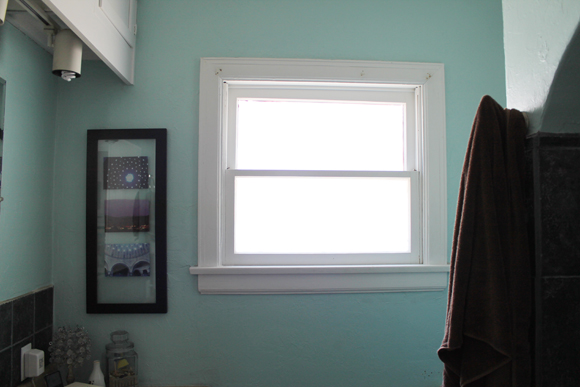 Frosting the window: The mini-blinds in our bathroom were seriously nastytown, but at the same time I’m also not crazy about using fabric to dress the window in a room that gets so moist. So, Doug and I took a cue from  Young House Love and frosted the window. This eliminates the need for a window treatment, but still ensures privacy. It also diffuses the light nicely. Image by me.
