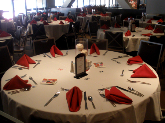 The buffet area was set up for a baseball-themed wedding reception. Cool!