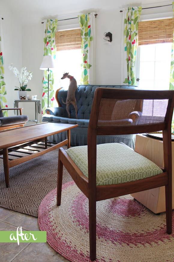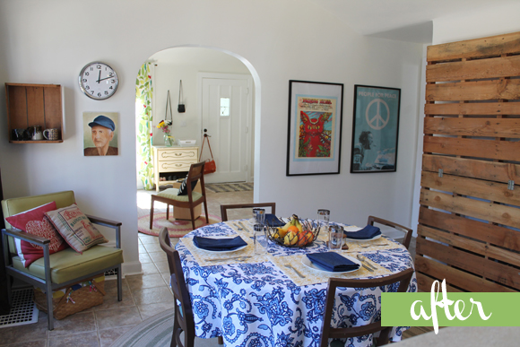 I am SUPER impressed with the living room, of all places! (Not just because of the before shot, which practically looks like a different home!) Really well put together, like something straight out of a magazine. I love how the leaf patterned drapes really come together in color between the blue couch and green chair, and adore the overlapping rugs. I’m a little curious about what got put in the fireplace though–it looks like old records?