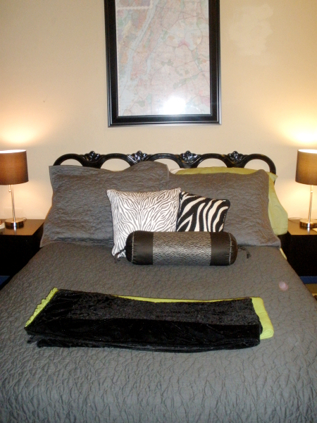 First, we had a map of New York City in a frame we got for our wedding, but the proportion was killing me. The wide bed+bedside tables and wide wall really deserves something with a more horizontal nature to it. Image below: awful, right?