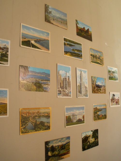 It’s not perfect, but the arrangement meets our color scheme (sort of–I mean there is a fair amount of green, and the blue goes with the blue baseboards and curtains–features of the room chosen by previous tenants that we’ve just left as-is). It’s wider than it is tall, although I could add one more “layer” around the edge to give it a grander scale–I just don’t have postcards that look like the rest (I tried to stick with illustrations rather than photos for a more antique feel). I used sticky tack, for the first time since my freshman year of college, since I didn’t want to do anything permanent to the cards and would feel guilty putting that many holes in the wall.