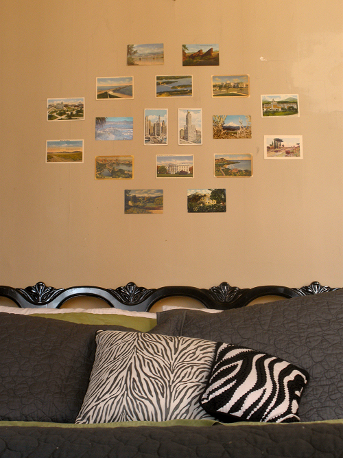 Sick of the blue tape, I took it all down (carefully, because I think the wall is in fact painted-over wallpaper, which likes to peel off) and put up some of the extra antique postcards I got in preparation for our wedding guestbook (we had guests write us a note on the back and we keep them in a box). I tried out a couple of different patterns flat on the bed before they went up on the wall.