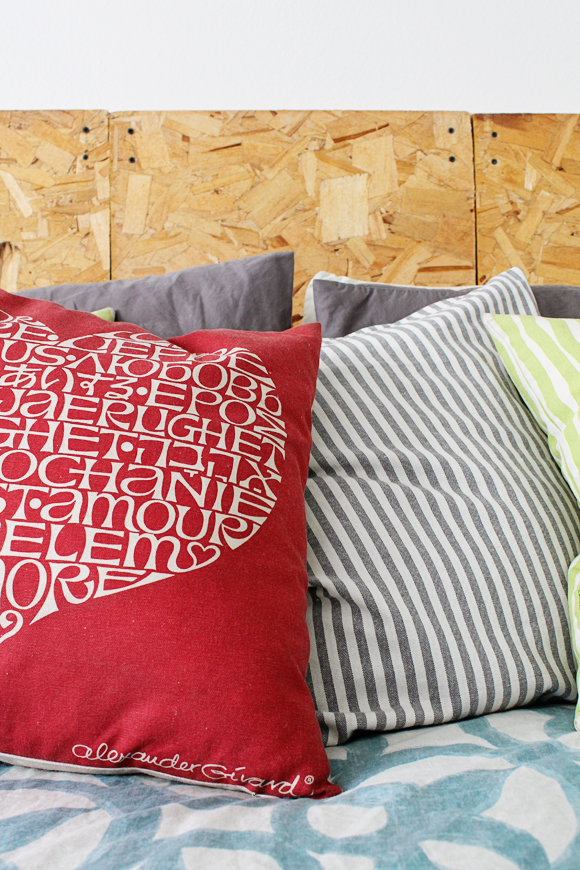 When pondering bed solutions, I realized that using the same materials, I could create a modern, fresh, E-A-S-Y, and cheap headboard.