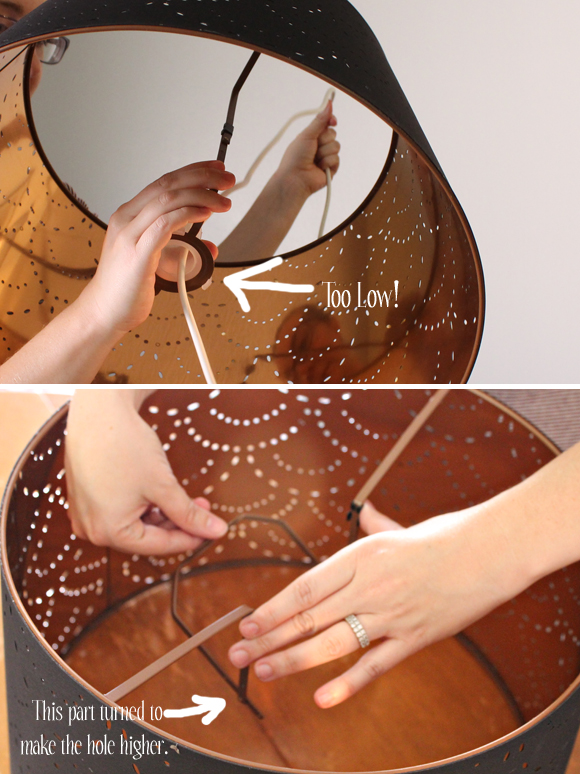 Then, I strung the light kit through the lampshade. This particular shade has a neat feature–it can be adjusted. The first time I strung the kit through, the light bulb peeked out at the bottom of the shade. So I pivoted the thingy (please forgive my lack of proper terminology) so that the bulb was positioned higher inside the shade. The following pictures will make more sense: