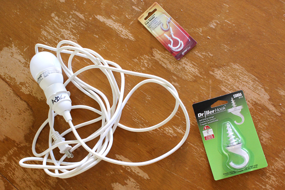 Enter the light kit we found in the as-is section of IKEA for $2. Yes, you read that right, $2. We nabbed it up and began the hunt for a suitable shade. I was really trying to get away from shopping at IKEA for everything, so we checked Target and Home Depot for shades. Okay, so it wasn’t an exhaustive search… later, we did find ourselves at IKEA and got a lampshade from them. The KILSMO, to be specific. So much for my quest to liven up my shopping destinations. Next we went to Lowe’s (which is conveniently right next door to IKEA) and grabbed two kinds of ceiling hooks: medium-duty and light-duty.