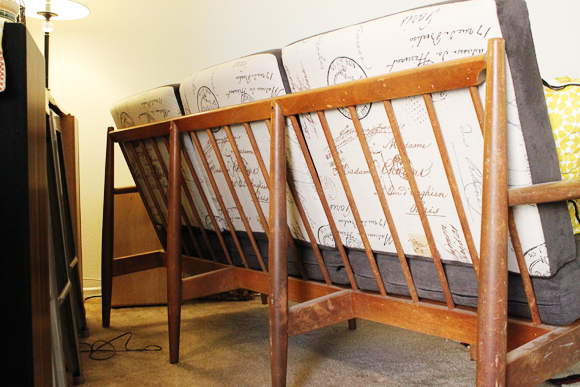 Painting the kitchen and dining room will be a huge improvement, and we are going to give it our best shot to get it done by Saturday. I’m not sure if it’s realistic, but like I said there’s nothing like a deadline to get the rear in gear. I do plan on finishing up the living room curtains and am trying to think of strategies as to not get rid of the plywood headboard (I love it too much! Photo from the old place).