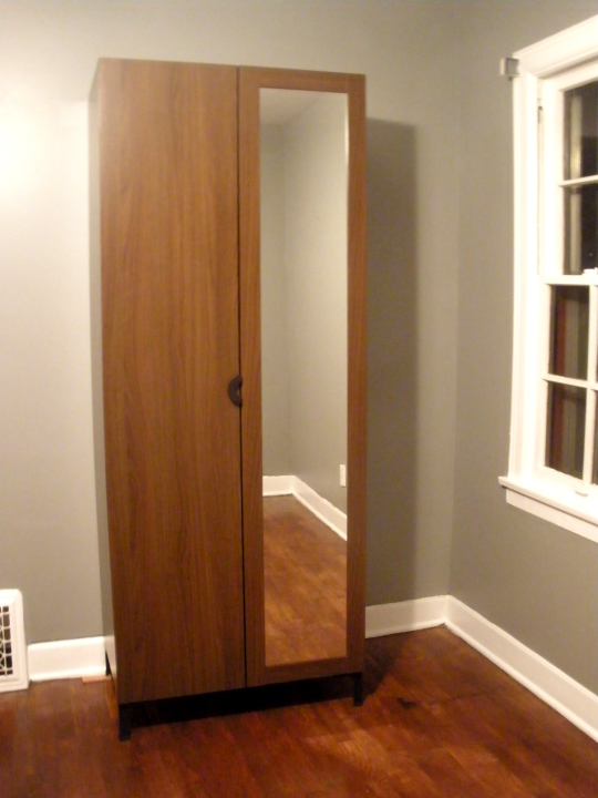 Lastly, due to the aforementioned downsizing of our hanging storage, the decision was made to come up with a hanging storage solution. I’m not boho enough to just get a garment rack and stick it in my bedroom for all to see (although I do think it would be cool, knowing me it’d get messy and look like a disaster) so we went with the concealed option: a wardrobe. We had the opportunity to get a great deal on a small PAX system, which is much more versatile, but the extremely light blonde wood was a sticking point with me. So, instead we got ENGAN because we liked the walnut effect and the mirror in the door. Last night we put it together (minus the doors) and it was tedious, sort of easy and sort of hard. Can’t really explain. Oh, and that particle board is HEAVY. When we stood it upright, the legs weren’t really straight and it wobbled to one side. SUPER demoralizing. But I shoved it against the wall which kind of helped stabilize it. Tonight we add the doors and call it a wrap.