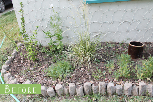 Bonus info: The plants we have growing in the “after” picture are, from left to right, rose of sharon, cosmos and zinnias, (grown from seeds!), pampas grass, an empty pot, elephant leaf (I think that’s what it is and it’s hiding behind the thick clump), another empty pot, and another rose of sharon. The clumps in front are all California poppies.