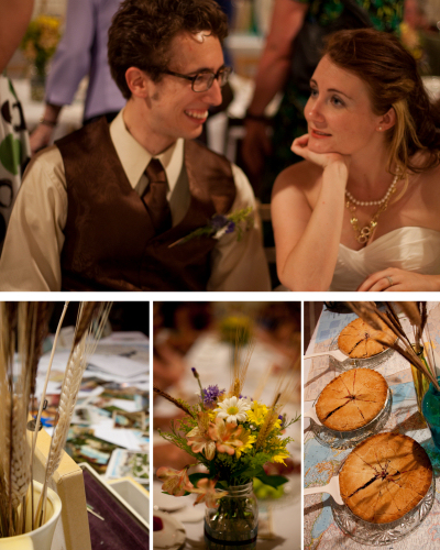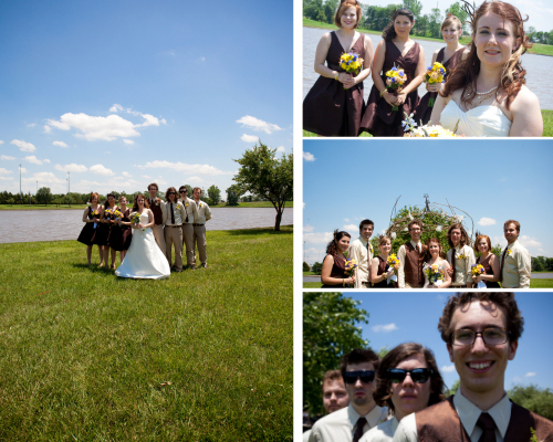 The wedding was held on Father’s Day, June 20, 2010. The ceremony was held at Wall Park in McPherson, against the best efforts of gale-force wind and extreme heat–believe it or not, I do not remember it being THAT hot ;) –but for the well-being of our guests and ourselves, the reception was held in the fellowship hall of McPherson Free Methodist church. Refreshments included cake, blueberry pie, other sweets, fruit (healthy!) and chips and salsa. A photobooth was set up in the adjoining room and produced some of my favorite pictures of the whole event. The guestbook consisted of vintage postcards purchased from antique stores; the guests wrote their message on their favorite card.